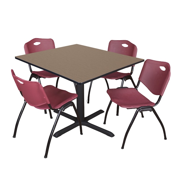 - Versatile table & chair set includes one 48-inch square Cain table and 4 Burgundy "M" Stack Chairs