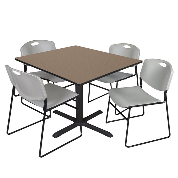 Square Cain Breakroom Table W/ 4 Zeng Stack Chairs, 48 in W, 48 in L, Noble Oak