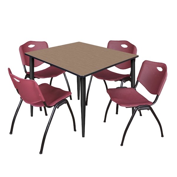 - Versatile table and chair set includes one 48-inch square table with modern black tapered legs and 4 Burgundy "M" Stack Chairs