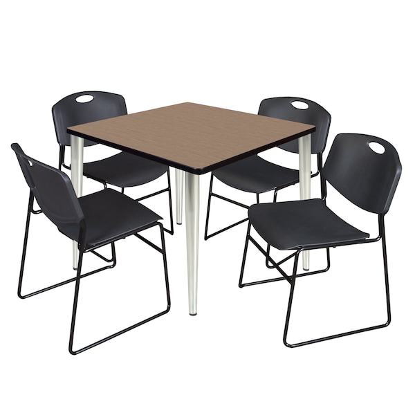 Square Kahlo Breakroom Table W/ 4 Zeng Stack Chairs, 36 in W, 36 in L, Noble Oak
