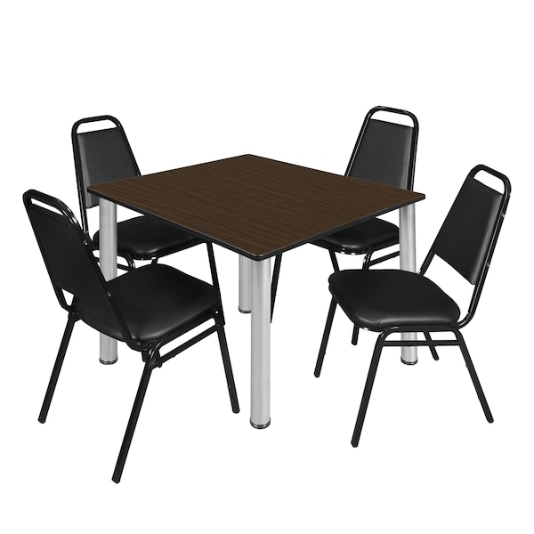 Square Kee Breakroom Table W/ 4 Restaurant Stack Chairs, 48 in W, 48 in L, Neo Walnut