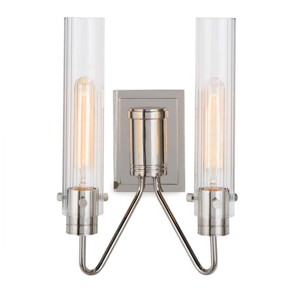 Regina Andrew Neo Sconce (Polished Nickel); Dimensions 9.5W x 14H x 5.5D; Uses two maximum 40 Watt E26 Base Bulbs (Not Included)