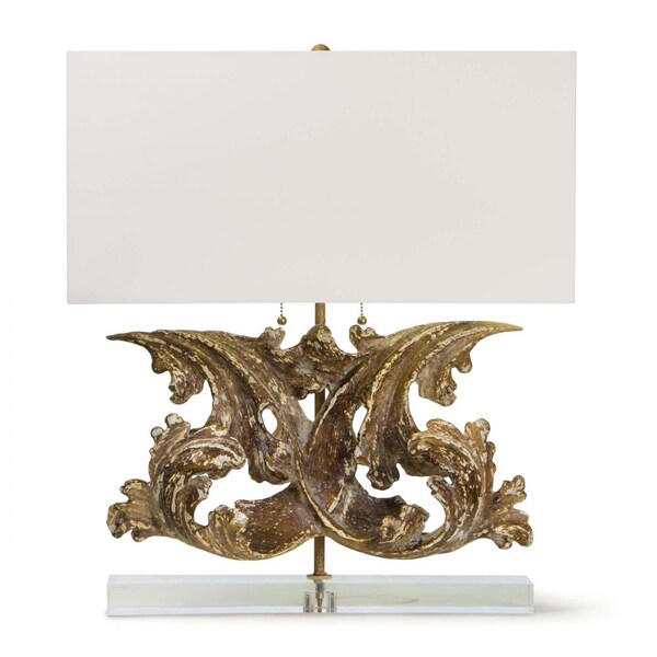Regina Andrew Scroll Table Lamp; Dimensions 23W x 26.5H x 10D; Uses two maximum 100 Watt E26 Base Bulbs (Not Included)