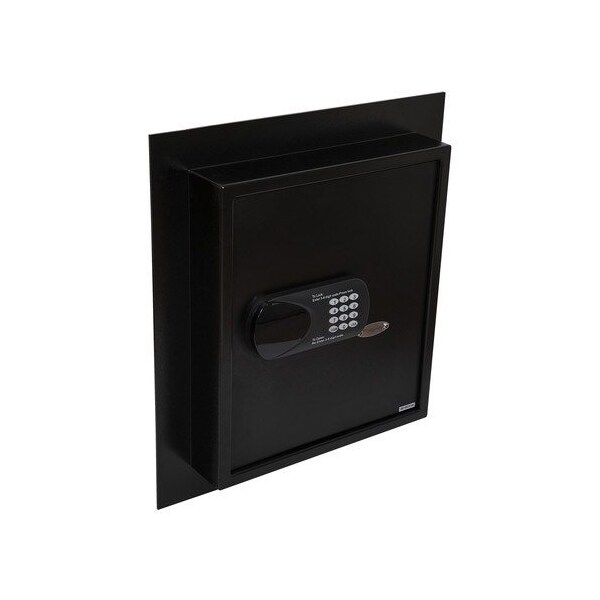 Registry Built-In Guest Room Wall Safe with motorized lock, LED display, and opening/closing audit trail capability up to 300 records. Will accommodate up to most standard 17 inch laptop computers. ADA compliant backlit keypad. Features emergency opening ability by CEU, programmable manager code, or included manual master key. Steel construction with long lasting black powder coated finish. Exterior Dimensions: 18 inch H x 15.75 inch W x 6.5 inch D. 4AA Batteries and basic mounting hardware included.