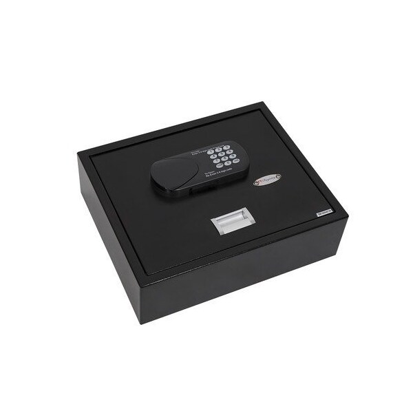 Registry Top-Opening Guest Room Safe with motorized lock, LED display, and opening/closing audit trail capability up to 300 records. Will accommodate up to most standard 15 inch laptop computers. ADA compliant backlit keypad. Features emergency opening ability by CEU, programmable manager code, or included manual master key. Steel construction with long lasting black powder coated finish. Exterior Dimensions: 5 inch H x 17 inch W x 14 inch D. 4AA Batteries and basic mounting hardware included.