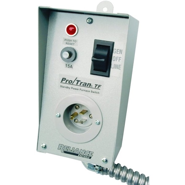 The Easy/Tran TF transfer switch is designed for the control of a single circuit, such as a forced-air furnace, in the event of a power failure. The attached 18 in flexible aluminum conduit is pre-wired and allows the TF to be easily connected at the circuit breaker panel or the furnace or at any point in between. Power can be supplied from a portable generator, inverter, RV generator, fuel cell or any standby source capable of producing sufficient current to operate the desired load. Uses standard grounded extension cord.