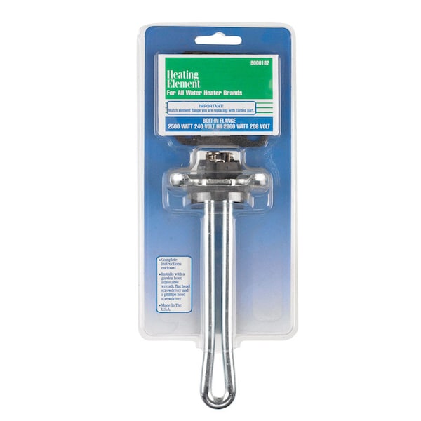 Universal Flange Water Heater Element. 2500 W, 240V, 10 in. Min. Tank Diameter, 4 hole square flange bracket. Supplied with square gasket. Fits most makes and models that do not use screw in flanges.