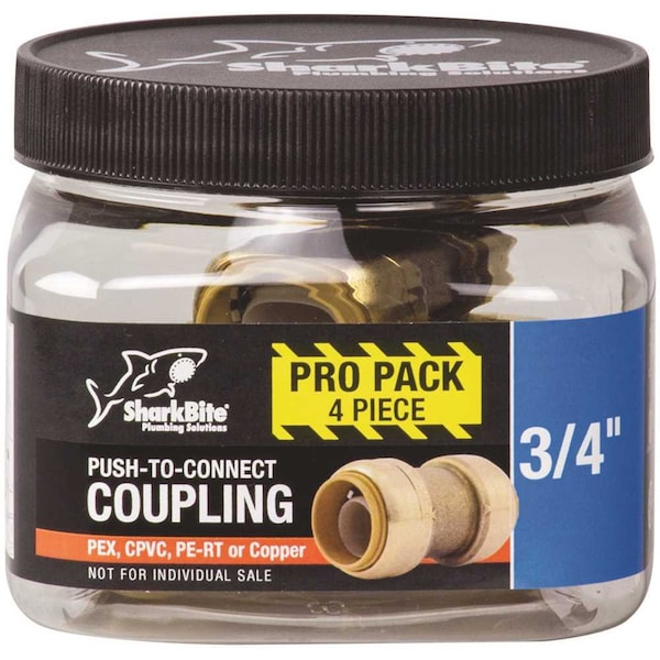 The 3/4 in. SharkBite Push-to-Connect Straight coupling is the easiest way to join copper, CPVC or PEX pipe in any combination with no soldering, clamps, unions or glue. Just insert the pipe and the stainless steel teeth bite down and grip tight, while a specially formulated O-ring compresses to create a perfect seal. Disassembly is just as fast using the simple disconnect tool so fittings and valves can be easily changed and reused. They can even be rotated after assembly for easier installation in tight spaces. SharkBite Fittings are certified for potable water supply and hydronic heating applications. Get SharkBite and get a grip on your next plumbing project.Lead free DZR brass construction for durability and reliability4-piece pro packUse to connect to any combination of copper, PEX, CPVC, or PE-RT pipesInnovative push-to-connect design makes for quick and easy installationRated to 200°F and 200 psiDemount clip allows user to release the fitting from the pipe for convenient installation flexibility sold separately3/4 in. pipe insertion depth = 1-1/8 in.