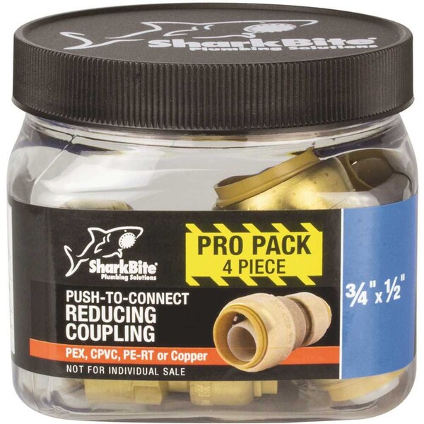 The 3/4 in. x 1/2 in. SharkBite Push-to-Connect Reducer coupling allows you to make a connection from 3/4 in. Pipe and reduce down to a 1/2 in. Pipe. SharkBite fittings are the easiest way to join copper, CPVC or PEX pipe in any combination with no soldering, clamps, unions or glue. Just insert the pipe and the stainless steel teeth bite down and grip tight, while a specially formulated O-ring compresses to create a perfect seal. Disassembly is just as fast using the simple disconnect tool so fittings and valves can be easily changed and reused. They can even be rotated after assembly for easier installation in tight spaces. SharkBite Fittings are certified for potable water supply and hydronic heating applications. Get SharkBite and get a grip on your next plumbing project.Lead free DZR brass construction for durability and reliabilityUse to connect to any combination of copper, PEX, CPVC, or PE-RT pipesInnovative push-to-connect design makes for quick and easy installationPush-to-connect fittings require no solder, glue, unions or toolsRated to 200°F and 200 psiDemount clip allows user to release the fitting from the pipe for convenient installation flexibility sold separately1/2 in. pipe insertion depth = 15/16 in. and 3/4 in. pipe insertion depth = 1-1/8 in.