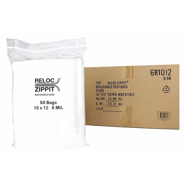 Reclosable Bag, 12 L, 10 in W, 6 mil Thick, Polypropylene, Clear