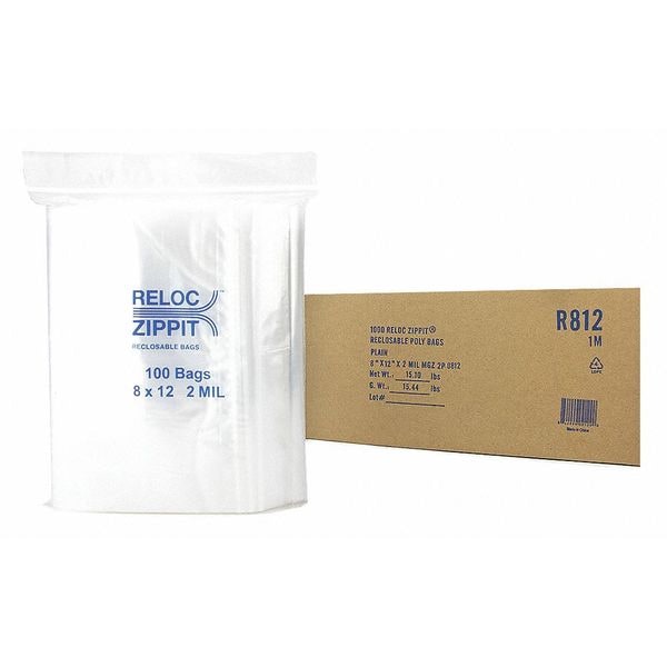 Reclosable Bag, 12 L, 8 in W, 2 mil Thick, Polypropylene, Clear