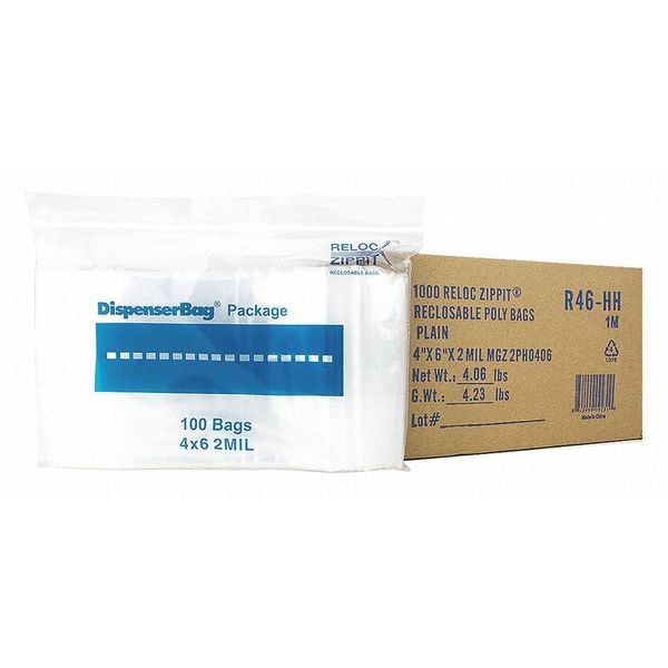Reclosable Bag, 6 L, 4 in W, 2 mil Thick, Polyethylene, Clear