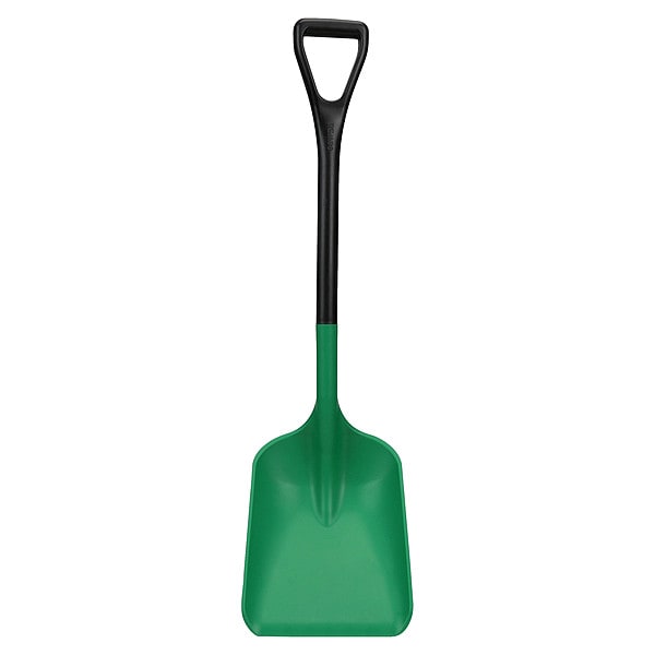 Industrial Shovel, Product Type Scoop Shovel, Blade Type Square Point, Blade Material Plastic, Number of Ribs 1, Blade Length 14 in, Blade Size #3, Blade Width 10 3/16 in, Blade Color Green, Handle Type D-Grip, Handle Material Polypropylene, Handle Length 25 in, Handle Color Black, Blade Step Not Applicable, Corrosion Resistant Yes, Detachable Handle Yes, ESD Safe No, Non-Sparking No, Overall Length 39 in