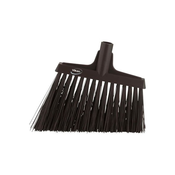 Vikan 29149 12in angle broom- extra stiff, black the angled design of this broom makes it easy to reach into narrow spaces between equipment when sweeping debris before the scrubbing action starts. It is particularly effective for collecting large particles of debris like meat and vegetables in a moist environment.