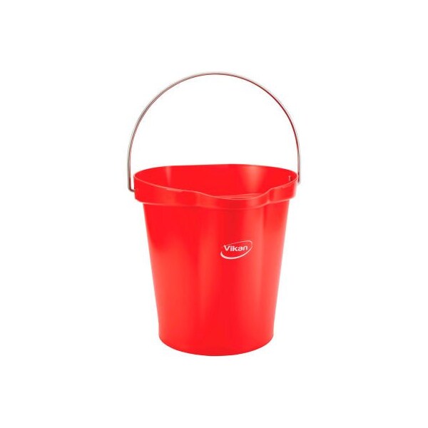 Vikan 56864 3 gallon bucket, red this bucket is ideal for transporting cleaning chemicals as well as hot or cold ingredients. It has a drip-free spout, hand grip that is raised from the base, sturdy stainless steel handle and is calibrated for a variety of measuring units. The flat side prevents spillage and stores easily using the coordinating wall bracket.
