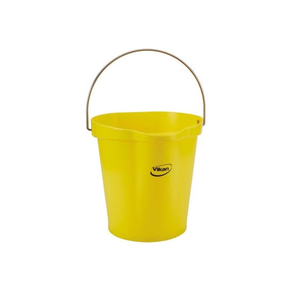 Vikan 56866 3 gallon bucket, yellow this bucket is ideal for transporting cleaning chemicals as well as hot or cold ingredients. It has a drip-free spout, hand grip that is raised from the base, sturdy stainless steel handle and is calibrated for a variety of measuring units. The flat side prevents spillage and stores easily using the coordinating wall bracket.