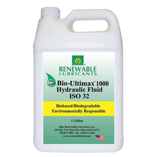 Hydraulic Fluid, Hydraulic, Ultimax 1000, Size 1 gal., Viscosity Index 184, ISO Viscosity Grade 32, Viscosity (SUS @ 100 F) 155, Temp. Range -30 to 250 Degrees F, Flash Point (F) 457, Pour Point (F) -40, Natural Vegetable Oil/Ester Base, Non-Toxic, Mild Odor, For Use In Hydraulic Vanes, Pumps, Mobile Service Hydraulic Equipment, Jacks, Denison T-5D, Vickers 20VQ, 35VQ-25 (M-2950-S), and V-104C (ASTM D-2882) Pump Stand Tests, Meets/Exceeds Federal Specifications A-A-59354 Superseding MIL-H-46001D