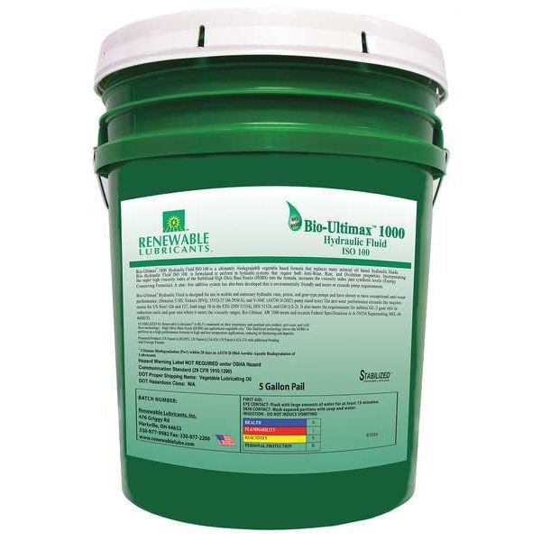 Oil, Hydraulic, Biodegradable Hydraulic Oil, Size 5 gal., Size/Net Weight 43 lb., Viscosity Index 199, ISO Viscosity Grade 100, Viscosity (SUS @ 100 F) 500, Viscosity (SUS @ 200 F) 64, Temp. Range -22 to 250 Degrees F, Flash Point (F) 536, Pour Point (F) -22
