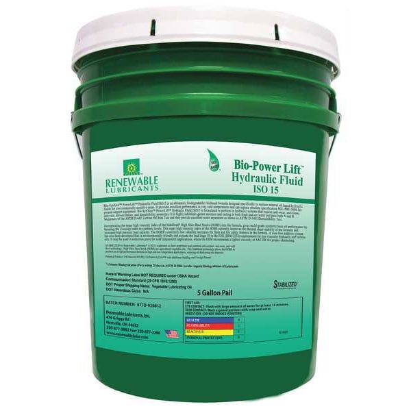 Oil, Hydraulic, Biodegradable Power Lift Hydraulic Fluid, Size 5 gal., Size/Net Weight 43 lb., Viscosity Index 185, ISO Viscosity Grade 15, Viscosity (SUS @ 100 F) 80, Viscosity (SUS @ 200 F) 38, Temp. Range -45 to 250 Degrees F, Flash Point (F) 370, Pour Point (F) -76