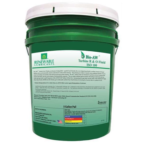 Oil, Hydraulic, Biodegradable Hydraulic Oil, Size 5 gal., Size/Net Weight 43 lb., Viscosity Index 196, ISO Viscosity Grade 100, Viscosity (SUS @ 100 F) 490, Viscosity (SUS @ 200 F) 62, Temp. Range -22 to 250 Degrees F, Flash Point (F) 536, Pour Point (F) -22