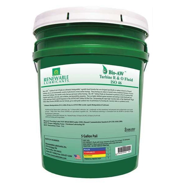 Hydraulic Oil,Natural Ester, Bio-Synthetic Base,Size 5 gal.,Container Type Pail,SAE Grade Not Specified,ISO Viscosity Grade 46,Viscosity Index 216,Color Yellow,Temp. Range -38 Degrees to 469 Degrees F,Pour Point -39 Degrees C,Flash Point 243 Degrees C,Specific Gravity 0.88,Four-Ball Wear 0.4mm,Viscosity @ 40C 43.8 cSt,Viscosity @ 100C 9.7 cSt,Application For Use In Hydraulic Systems That Require Anti-Wear, Anti-Foam, Anti-Rust, Anti-Oxidation and Demulsibility Properties