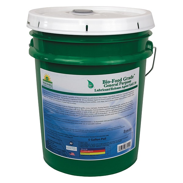 General Purpose Lubricant, Wet, Renewable Lubricants, Bio-Food Grade, Net Fill 5 gal, Container Size 5 gal, Lubricant Container Pail, Vegetable Oil, No Additives Primary Additive, Min. Operating Temp. 32 Degrees F, Max. Operating Temp. 622 Degrees F, NSF Rating H1, 50 State VOC Compliant Yes, VOC Content 0 Percent, Lubricant Color Yellow, Odorless Yes, Non-Flammable Flammability, Non-Flammable, Flash Point 622 Degrees F
