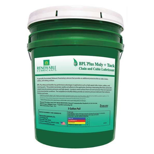 Chain and Wire Rope Lubricant, Pail, Vegetable Oil, Molybdenum, Not Rated, Renewable Lubricants, 5 gal, -22 Degrees F, 294 Degrees F, Liquid