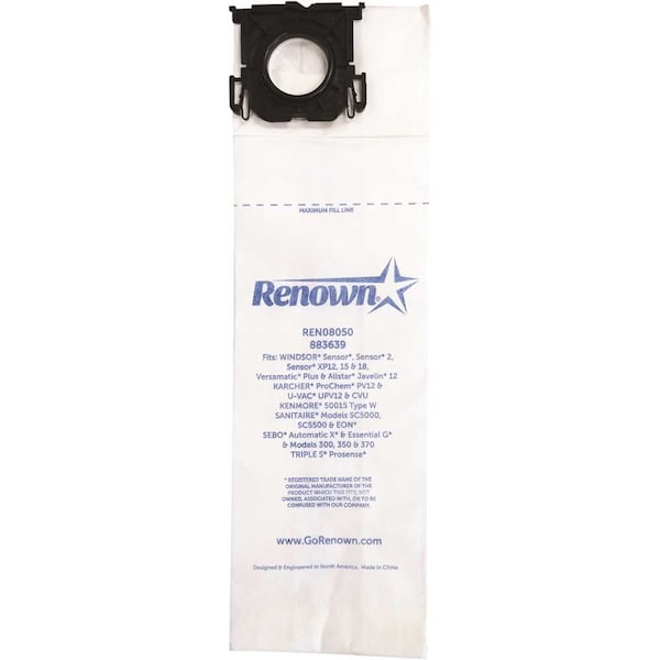 More than just a brand name, Renown represents a customer-focused approach that extends beyond distribution to reducing your total cost of operation through product acquisition and utilization. Renown provides exceptional value on the industry's leading products with best-in-class industry partnerships that deliver the highest quality products every day. Expertise you can count on.Designed to fit: Windsor Sensor, Sensor 2 and Sensor XP, Versamatic Plus, Karcher ProChem PV12 and U-Vac UPV12, Kenmore 50015, Triple S ProSense, Sanitaire EON, SC5000 and SC5500, Sebo Automatic X Series and Essential G series and models 300, 350 and 370Equivalent to OEM#: 5300, 86000500, 86284840, 8.600-050.0, 20-50015, 50015, 5093AM, RL, 681043-ply combination paper and melt blown micro filter10-vacuum bags per package