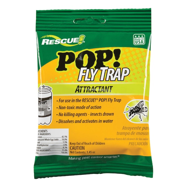Rescue! POP! Fly Refill works inside the Rescue! Reusable POP! Fly Trap. Each refill packet contains one application that generally lasts two weeks to a month. Just drop the water-soluble pouch into the trap container, add water to the fill line, replace the top and hang or place the trap outside near a fly source.