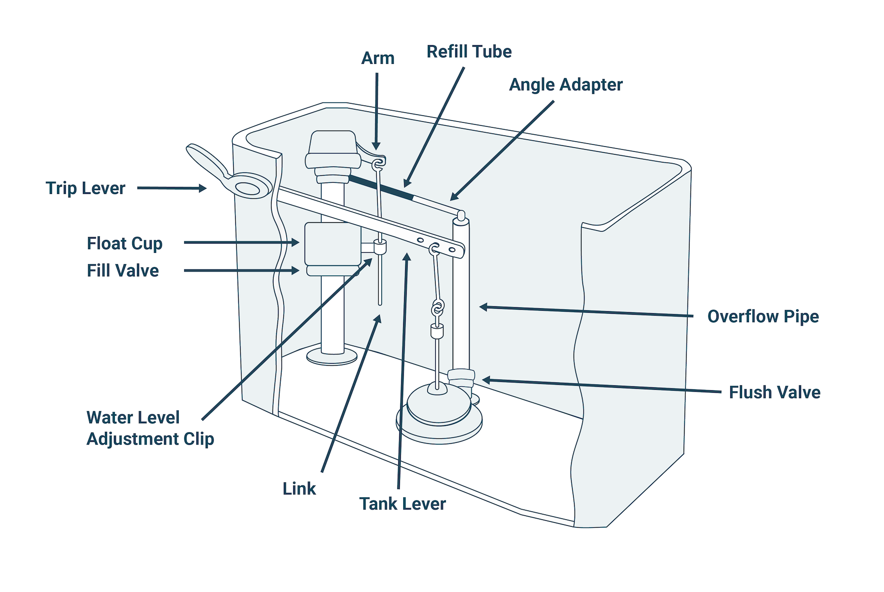 The refill tube and angle adapter supplies fresh water to the toilet bowl once the toilet is flushed. The refill tube is connected to the overflow tube by the angle adapter, while water is supplied through a barbed fitting on the fill valve.