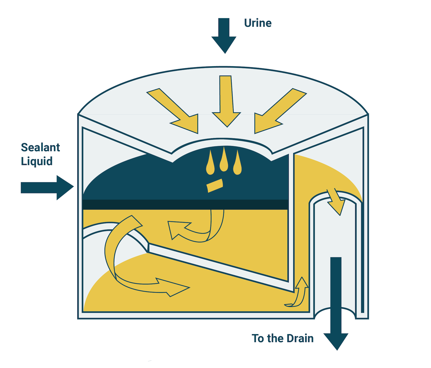 When the urinal is used, urine is directed into a collection area in the center of the cartridge. Inside the collection area of the cartridge, a sealant liquid remains at the top of the opening. This sealant layer allows the urine to pass through it, keeping urine blocked underneath so sewer gases and urine odors cannot escape into the restroom. Once the collection area of the cartridge has filled to a designated point, an internal trap directs the urine to an outlet, letting it flow into the drain line and out of the urinal cartridge.