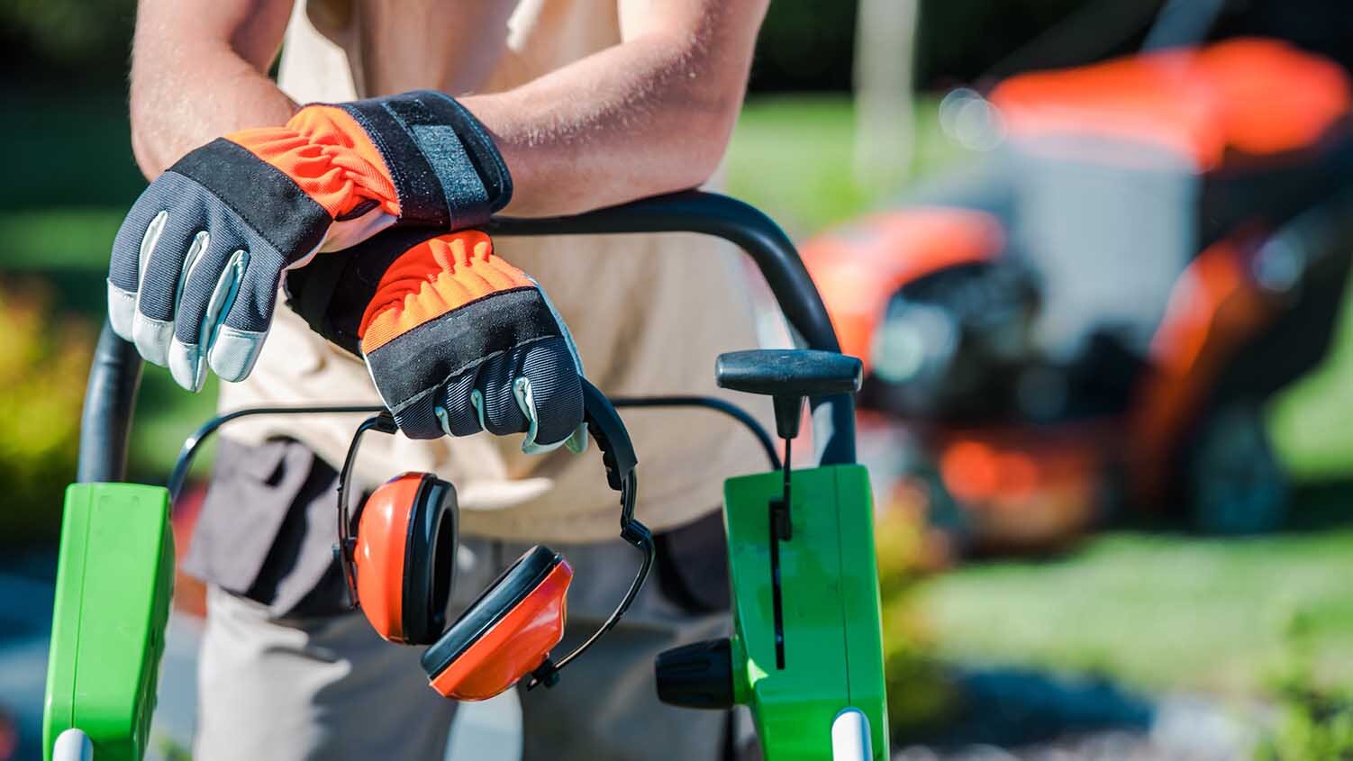 Wear protective safety glasses to shield yourself from potential flying debris, and use hearing protection to muffle the sound of the mower engine. Also, be sure to wear closed-toe, sturdy footwear along with long pants to protect your feet and legs.