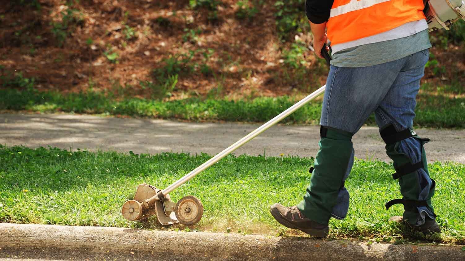 Line trimmers, on the other hand, can trim anywhere—in tight spaces, next to flower beds, along a hard surface, and more. To use a line trimmer to edge a lawn, turn the trimmer head 180 degrees so that it’s vertical. Be sure to keep the deflector shield toward your body to avoid getting hit by any flying debris. If you're edging along a driveway or sidewalk, always walk on the hard surface of the driveway or sidewalk as you edge for maximum safety and support. Be sure the trim line stays within the small space between the grass and hard surface. If the grass is too long and has overgrown the driveway or sidewalk, work methodically and cut it back a little at a time until it has a nice finished edge.