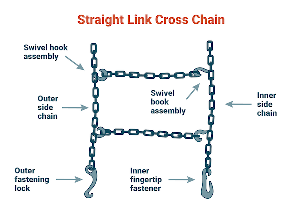 Your snow chains might need to be untangled before putting them on. After straightening the chains, make sure the steel hooks on the cross chains are facing downward. (If they are faced in, they could damage tires or even cause a blowout.) Find the fastening lock on the outside of the side chain and ensure it is facing the outside of the wheel.