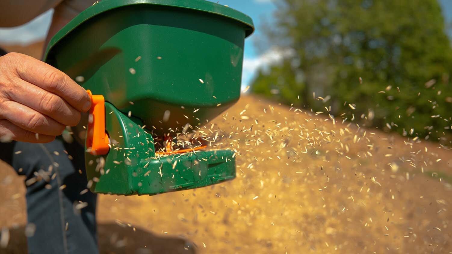 After you've prepped, smoothed, and amended the soil, use a spreader to disperse the seed. A broadcast or rotary spreader is a walk-behind or hand-held spreader that spreads grass seed by fanning it out in a circular pattern. It's effective in covering large areas, but not as accurate in tight spaces. For better accuracy in tight spaces and on smaller areas, a drop spreader is more effective. It drops seed straight down in a path the width of the walk-behind spreader while moving across your lawn. With either style, try to avoid getting grass seed or fertilizer in garden beds or on the driveway and sidewalk.