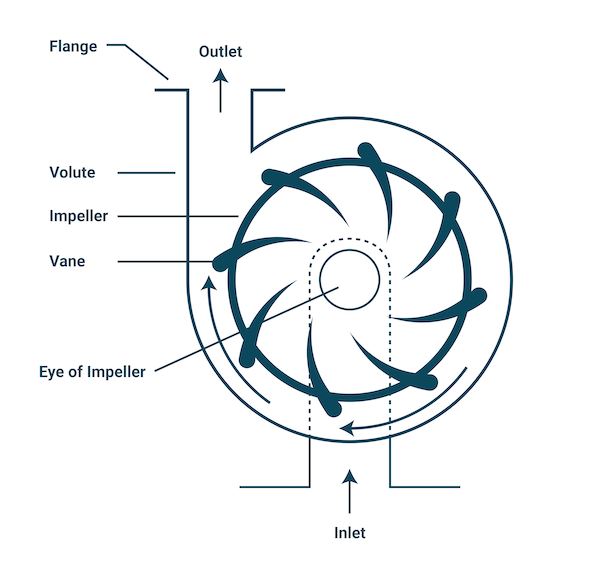 All centrifugal pumps function by using an impeller, which is an internal rotating wheel that adds energy to a fluid being pumped. When in action, the fluid or liquid being pumped will enter the inlet port at the center of the rotating impeller (or eye impeller). As the impeller is spinning in a counter-clockwise direction, the fluid being pumped is thrust outward radially, which causes centrifugal acceleration. While doing this, the rotating impeller creates a vacuum in its wake and draws even more fluid into the inlet. The faster the impeller rotates, the faster the fluid movement and the stronger its force.