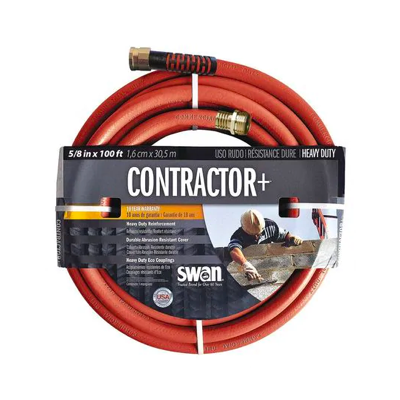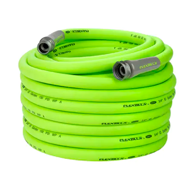 | This rubber garden hose can carry both hot and cold water at high pressure and works well in commercial settings like landscaping and washing equipment and facilities. | With a larger ¾" interior diameter, this abrasion-resistant rubber garden hose carries a greater volume of water. It has heavy-duty fittings and can handle water pressure in excess of 400 psi. | Some hoses are made of a combination of materials, such as this blend of rubber and plastic. It’s much lighter and more flexible than similar-sized rubber hoses, and the material greatly reduces kinking. |