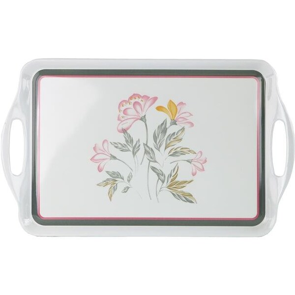 Features Dimensions are 19.5 x 10.5 x 0.9 inches - 1.4 pounds Serving tray measuring 11-.5 by 19 inches Made from 100 percent melamine plastic Flower design has subtle peach - pink - green and blue hues Coordinates with other Pink Trio tableware Hand wash - 3-year warranty