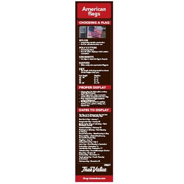 Features -Contains aisle violator with peg arm -High quality design Contains -1 Blade Sign & 1 Bracket for Hanging Sign Blade Sign -American Flags Choosing a Flag Proper Display Dates to Display Packed 1 Kit per Box with Instructions Specifications - Weight: 2 lbs