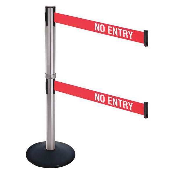 Barrier Post with Belt, Legend No Entry, Number of Belts 2, Belt Length 10 ft, Belt Width 3 in, Belt Color Red with White Text, Product Type Stanchion, Includes Hose Clamp Fixing and Wire Clip Belt End, Minimum Overall Height Not Applicable, Post Diameter 2 1/2 in, Post Material Aluminum, Post Finish Satin Stainless Steel, Base Type Sloped, Base Diameter 14 in, Base Material Cast Iron, Base Finish Powder Coated, ADA Compliance No, Indoor/Outdoor Usage Indoor