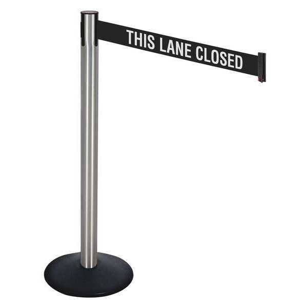 Barrier Post with Belt, Legend This Lane Closed, Number of Belts 1, Belt Length 10 ft, Belt Width 3 in, Belt Color Black with White Horizontal Stripe, Product Type Stanchion, Includes Hose Clamp Fixing and Wire Clip Belt End, Minimum Overall Height Not Applicable, Post Diameter 2 1/2 in, Post Material Stainless Steel, Post Finish Satin Stainless Steel, Base Type Sloped, Base Diameter 14 in, Base Material Cast Iron, Base Finish Powder Coated, ADA Compliance No, Indoor/Outdoor Usage Indoor