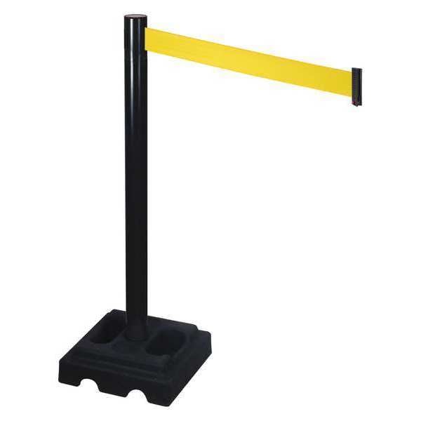 Barrier Post with Belt, Maximum Overall Height 40 in, Legend No Legend, Number of Belts 1, Belt Length 10 ft, Belt Width 3 in, Belt Color Yellow, Post Color Black, Product Type Stanchion, Includes Carrying Handle, Minimum Overall Height Not Applicable, Post Diameter 2 1/2 in, Post Material Aluminum, Post Finish Black, Base Type Square, Base Diameter 14 in, Base Material Rubber, Base Finish Black, Base Color Black, ADA Compliance No, Resistance Properties Rust Resistant