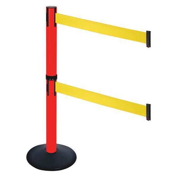 Barrier Post with Belt, Maximum Overall Height 40 in, Legend No Legend, Legend Color Not Applicable, Number of Belts 2, Belt Length 10 ft, Belt Width 3 in, Belt Color Yellow, Post Color Red, Product Type Stanchion, Includes Hose Clamp Fixing, Wire Clip Belt End, Minimum Overall Height Not Applicable, Post Diameter 2 1/2 in, Post Material Plastic, Post Finish Powder Coated, Base Type Round Sloped, Base Diameter 14 in, Base Material Cast Iron, Base Finish Powder Coated, Base Color Black