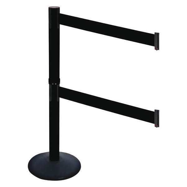 Barrier Post with Belt, Maximum Overall Height 40 in, Legend No Legend, Legend Color Not Applicable, Number of Belts 2, Belt Length 10 ft, Belt Width 3 in, Belt Color Black, Post Color Black, Product Type Stanchion, Includes Hose Clamp Fixing, Wire Clip Belt End, Minimum Overall Height Not Applicable, Post Diameter 2 1/2 in, Post Material Plastic, Post Finish Powder Coated, Base Type Round Sloped, Base Diameter 14 in, Base Material Cast Iron, Base Finish Powder Coated, Base Color Black