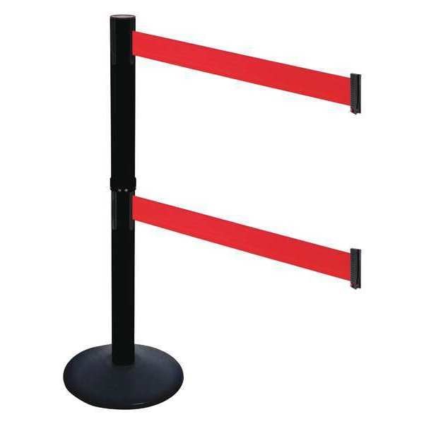 Barrier Post with Belt, Maximum Overall Height 40 in, Legend No Legend, Legend Color Not Applicable, Number of Belts 2, Belt Length 10 ft, Belt Width 3 in, Belt Color Red, Post Color Black, Product Type Stanchion, Includes Hose Clamp Fixing, Wire Clip Belt End, Minimum Overall Height Not Applicable, Post Diameter 2 1/2 in, Post Material Plastic, Post Finish Powder Coated, Base Type Round Sloped, Base Diameter 14 in, Base Material Cast Iron, Base Finish Powder Coated, Base Color Black