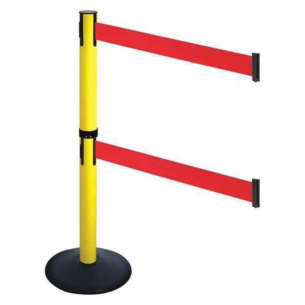 Barrier Post with Belt, Maximum Overall Height 40 in, Legend No Legend, Legend Color Not Applicable, Number of Belts 2, Belt Length 10 ft, Belt Width 3 in, Belt Color Red, Post Color Yellow, Product Type Stanchion, Includes Hose Clamp Fixing, Wire Clip Belt End, Minimum Overall Height Not Applicable, Post Diameter 2 1/2 in, Post Material Aluminum, Post Finish Powder Coated, Base Type Round Sloped, Base Diameter 14 in, Base Material Cast Iron, Base Finish Powder Coated, Base Color Black
