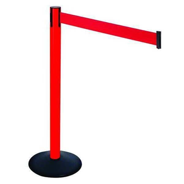 Barrier Post with Belt, Maximum Overall Height 40 in, Legend No Legend, Legend Color Not Applicable, Number of Belts 1, Belt Length 10 ft, Belt Width 3 in, Belt Color Red, Post Color Red, Product Type Stanchion, Includes Hose Clamp Fixing, Wire Clip Belt End, Minimum Overall Height Not Applicable, Post Diameter 2 1/2 in, Post Material Plastic, Post Finish Powder Coated, Base Type Round Sloped, Base Diameter 14 in, Base Material Cast Iron, Base Finish Powder Coated, Base Color Black