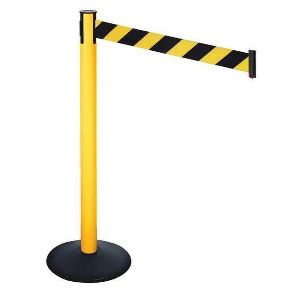 Barrier Post with Belt, Maximum Overall Height 40 in, Legend No Legend, Legend Color Not Applicable, Number of Belts 1, Belt Length 10 ft, Belt Width 3 in, Belt Color Black/Yellow, Belt Pattern Diagonal Stripe, Post Color Yellow, Product Type Stanchion, Includes Hose Clamp Fixing, Wire Clip Belt End, Minimum Overall Height Not Applicable, Post Diameter 2 1/2 in, Post Material Plastic, Post Finish Powder Coated, Base Type Round Sloped, Base Diameter 14 in, Base Material Cast Iron