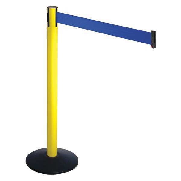 Barrier Post with Belt, Maximum Overall Height 40 in, Legend No Legend, Legend Color Not Applicable, Number of Belts 1, Belt Length 10 ft, Belt Width 3 in, Belt Color Blue, Post Color Yellow, Product Type Stanchion, Includes Hose Clamp Fixing, Wire Clip Belt End, Minimum Overall Height Not Applicable, Post Diameter 2 1/2 in, Post Material Aluminum, Post Finish Powder Coated, Base Type Round Sloped, Base Diameter 14 in, Base Material Cast Iron, Base Finish Powder Coated, Base Color Black
