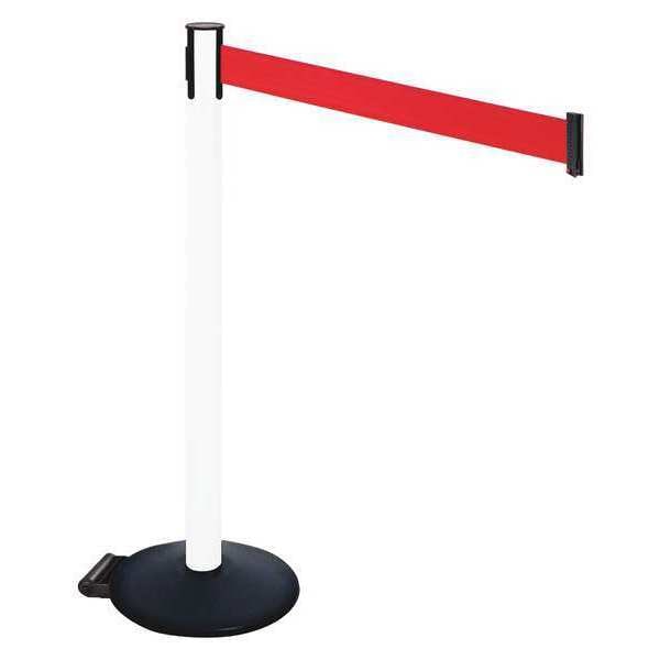 Barrier Post with Belt, Maximum Overall Height 40 in, Legend No Legend, Legend Color Not Applicable, Number of Belts 1, Belt Length 10 ft, Belt Width 3 in, Belt Color Red, Post Color Black, Product Type Stanchion, Includes (2) Wheels, Minimum Overall Height Not Applicable, Post Diameter 2 1/2 in, Post Material Vinyl, Post Finish Powder Coated, Base Type Round Sloped, Base Diameter 14 in, Base Material Cast Iron, Base Finish Powder Coated, Base Color Black, ADA Compliance No